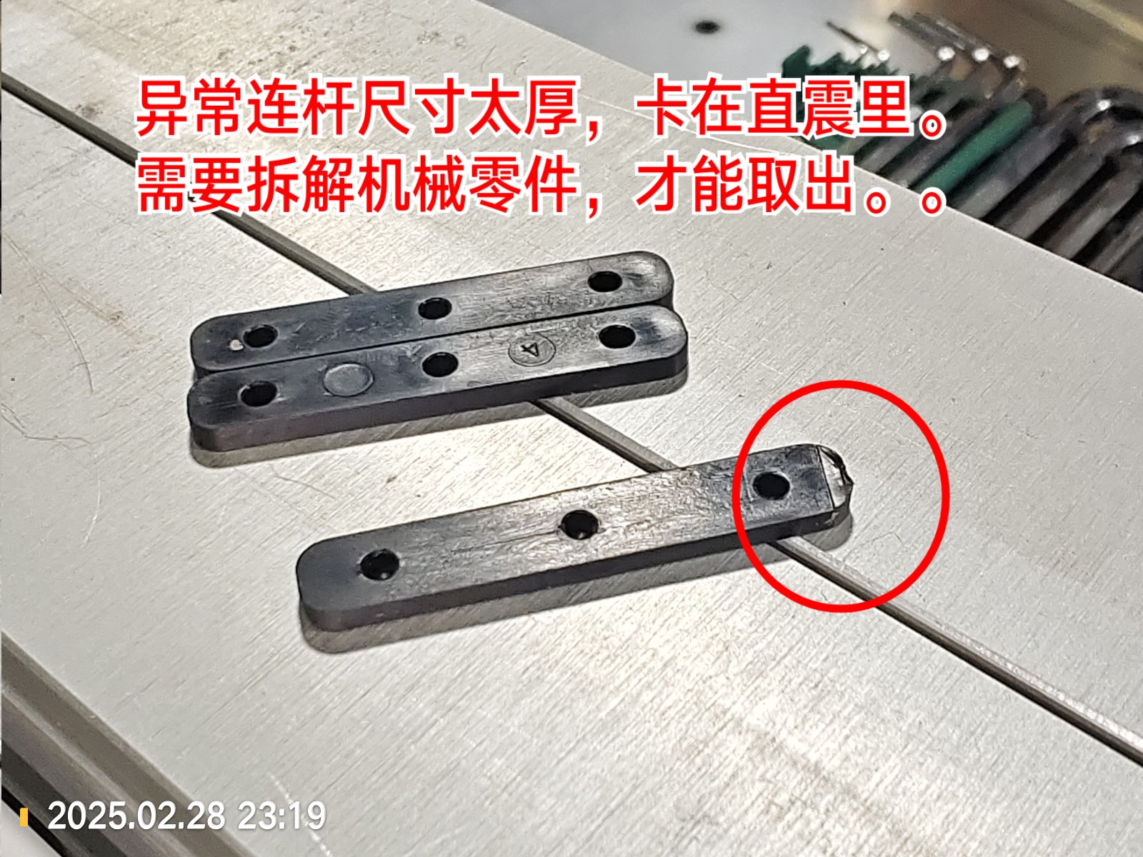 方卡扣,圆震,这个位置总是发生这样的卡料。 |