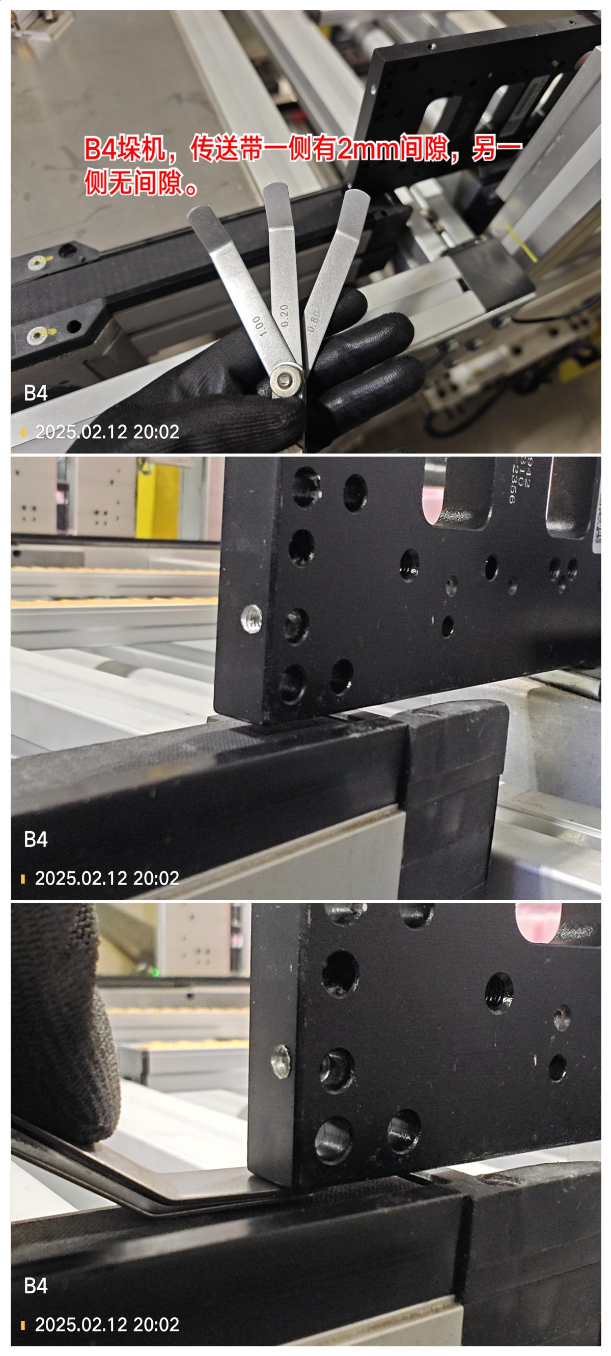 B4垛机,传送带一侧有2mm间隙,另一侧无间隙。 |
