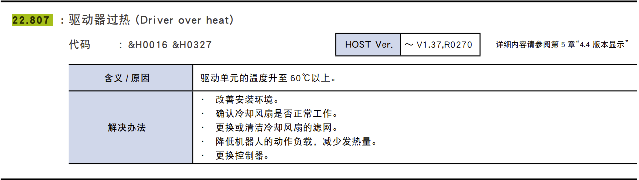 Yamaha robot 控制器故障代码 807 E22 , 温度过高 |